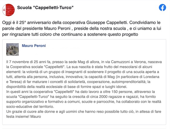 La Cooperativa Sociale “Cappelletti” è nata nel 1995 principalmente per gestire scuole e servizi scolastici; costituita inizialmente solo da personale docente e non docente, gestisce tutt’ora la Scuola secondaria di I grado " CAPPELLETTI- TURCO" di Colognola ai Colli.